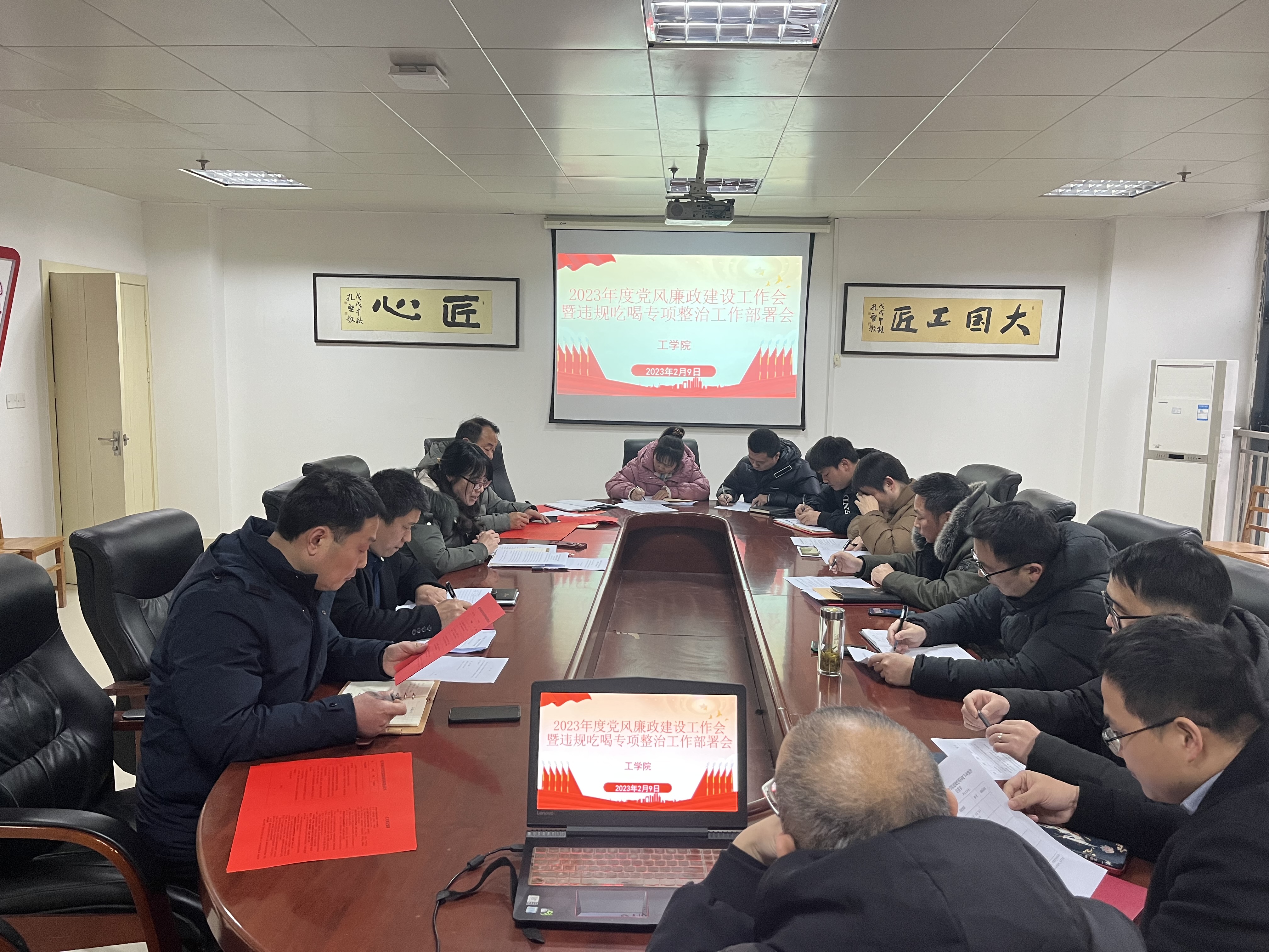 2月9日下午,太阳成集团tyc122cc在理工楼9楼会议室召开2023年度党风廉政建设工作暨违规吃喝问题专项整治工作动员部署会,全体干部和各党组织支委成员参加了会议,会议由工公司党总支书记柳明珠主持。