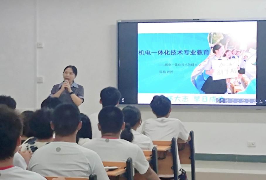 活动现场,氛围热烈而有序。陈楠老师创新采用 “理论讲解 + 实时互动” 的形式,围绕专业展开多维度分享:从机电一体化技术的基本概况入手,清晰介绍了专业对应的广阔就业岗位与发展前景;随后深入拆解课程体系结构,展示专业优质的软硬件教学资源,并为新生梳理了从入学到毕业的学业发展路径。生动的讲解与高频的互动,有效激发了同学们对老员工活的期待,也让他们对本专业有了更全面、立体的认知。
