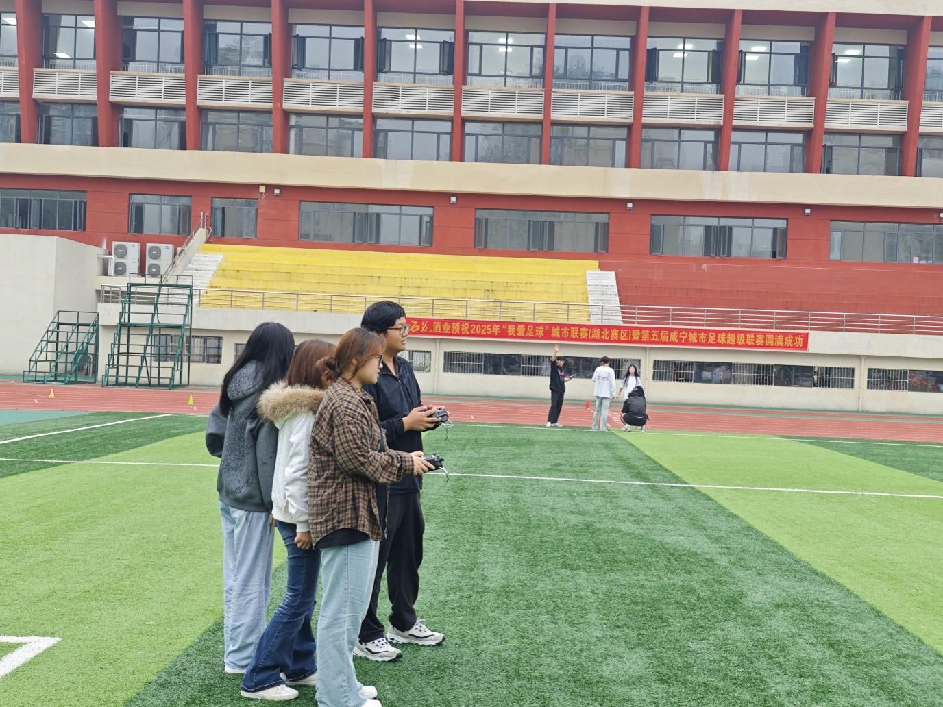第二站,实习队伍来到了集团足球场,开启实践操作篇章。湖北宇一低空科技有限公司技术团队带来了满满的 “干货”—— 从无人机电池安装、遥控器校准等基础操作,到飞行姿态控制、应急降落等安全规范,技术导师通过 “理论讲解 + 示范操作” 的方式,将复杂的飞行原理转化为通俗易懂的实操技巧。“左手控制高度,右手调节方向,注意保持遥控器平稳……” 在导师的耐心指导下,员工们分组轮流上手,操控着无人机完成起飞、悬停、水平飞行等基础动作。当看到自己操控的无人机平稳盘旋在足球场上空时,员工们脸上洋溢着兴奋与自豪。带队教师表示:“实操环节让抽象的理论知识变得直观可感,有效提升了员工的专业兴趣和动手能力,为后续专业课程的教学奠定了良好基础。”