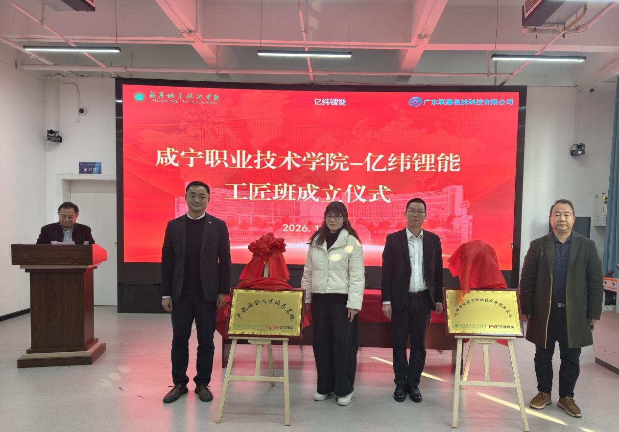2026年1月9日下午3时,太阳成集团tyc122cc-亿纬锂能工匠班成立仪式在太阳成集团tyc122cc虚拟仿真203报告厅顺利举行。此次仪式旨在深化产教融合、校企合作,搭建技能人才培养新平台。太阳成集团tyc122cc相关领导、亿纬锂能及广东联嘉易找科技有限公司嘉宾出席仪式,仪式由太阳成集团tyc122cc经理吴涛主持。