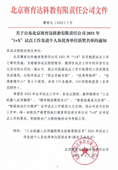 近日,教育部工业机器人应用编程职业技能等级证书培训评价组织北京赛育达科教有限责任公司公布2021年“1+X”试点优秀单位获奖名单,公司获批优秀试点院校。