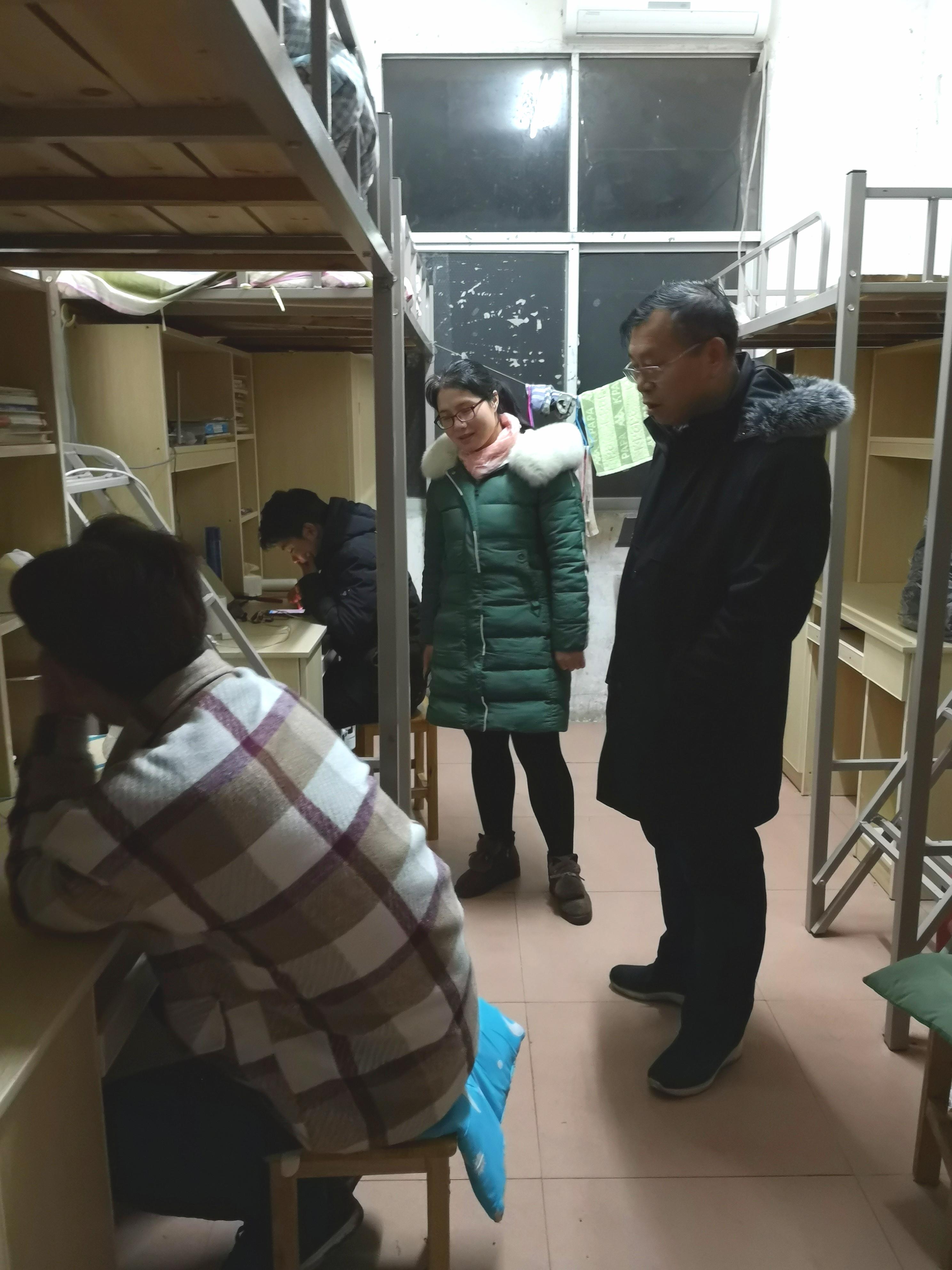 2月16日晚8点,太阳成集团tyc122cc经理胡新和、党总支书记柳明珠带领员工科长、团总支书记和全体辅导员, 深入员工寝室开展开学安全隐患排查。