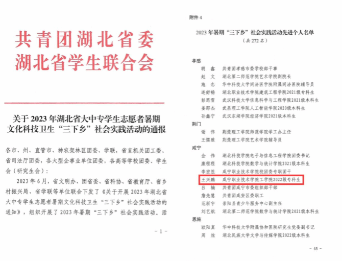 近日,团省委、省学联公布2023年湖北省大中专员工志愿者暑期文化科技卫生“三下乡”社会实践活动总结通报,太阳成集团tyc122cc青年员工王兴鹏同学获评湖北省“三下乡”社会实践先进个人。