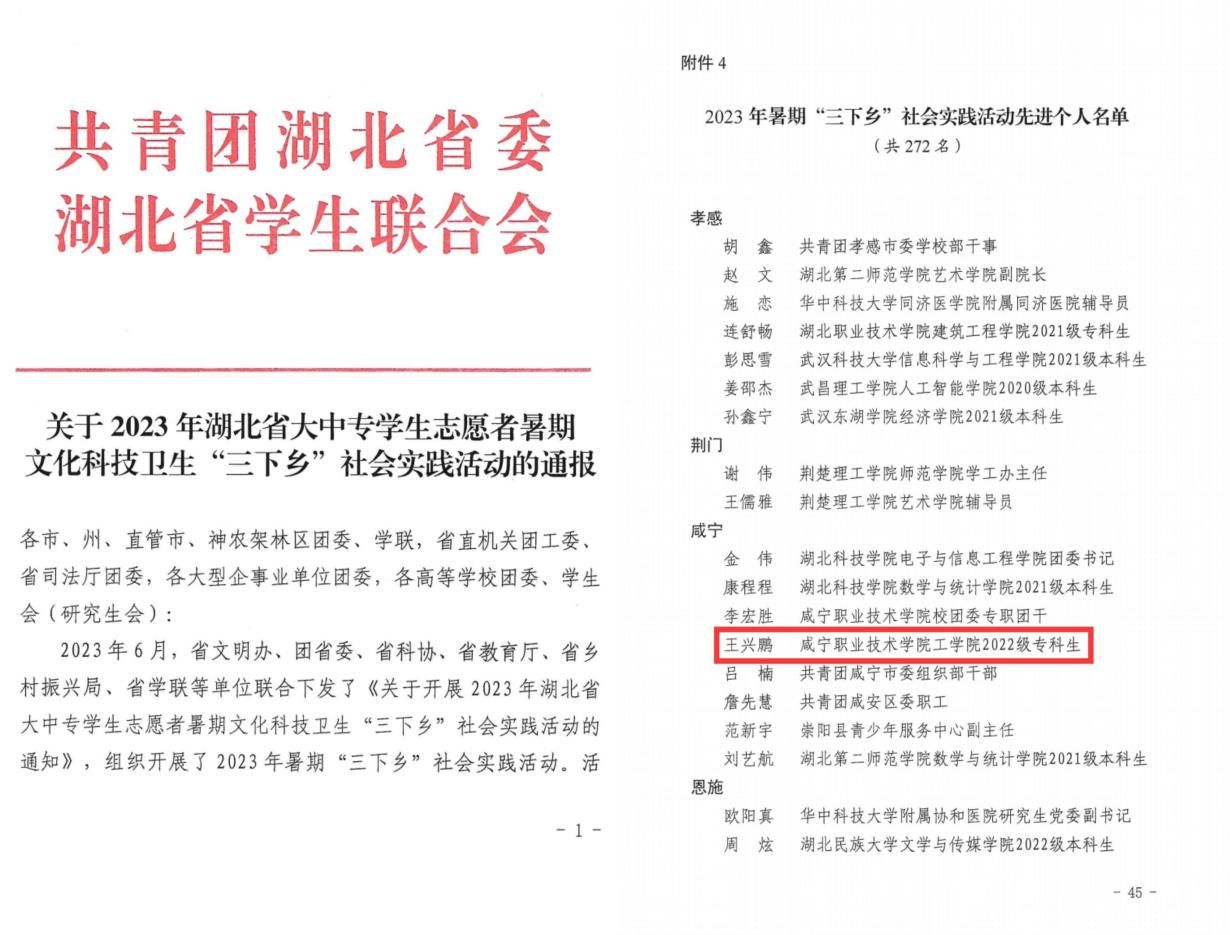 近日,团省委、省学联公布2023年湖北省大中专员工志愿者暑期文化科技卫生“三下乡”社会实践活动总结通报,太阳成集团tyc122cc青年员工王兴鹏同学获评湖北省“三下乡”社会实践先进个人。