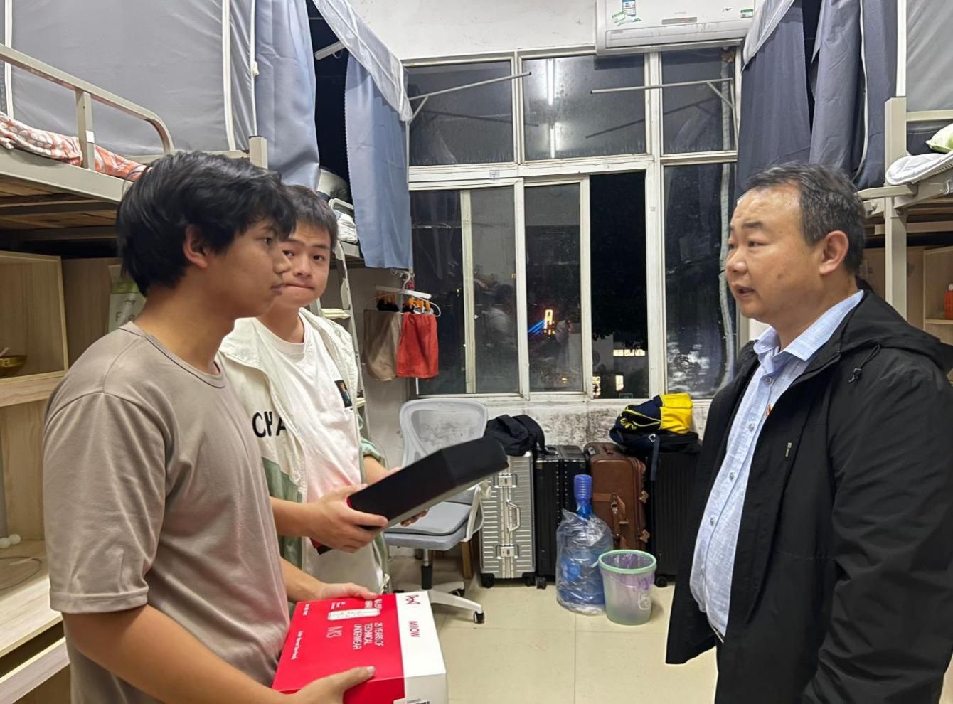 吴涛在走访过程中热情地与同学进行交谈,亲切地询问员工的学习生活情况。看到穿着单薄的同学,他一再叮嘱:“一定要注意保暖,有空的时候一定要多给家里打电话”;吴经理还发现了不少同学在寝室里刻苦学习,他对此表示了高度的赞赏,并与他们进行了深入的交谈,询问他们的学习计划、学习方法以及未来的职业规划。吴经理的话语中充满了鼓励与期待,激励同学们继续努力学习,追求卓越。