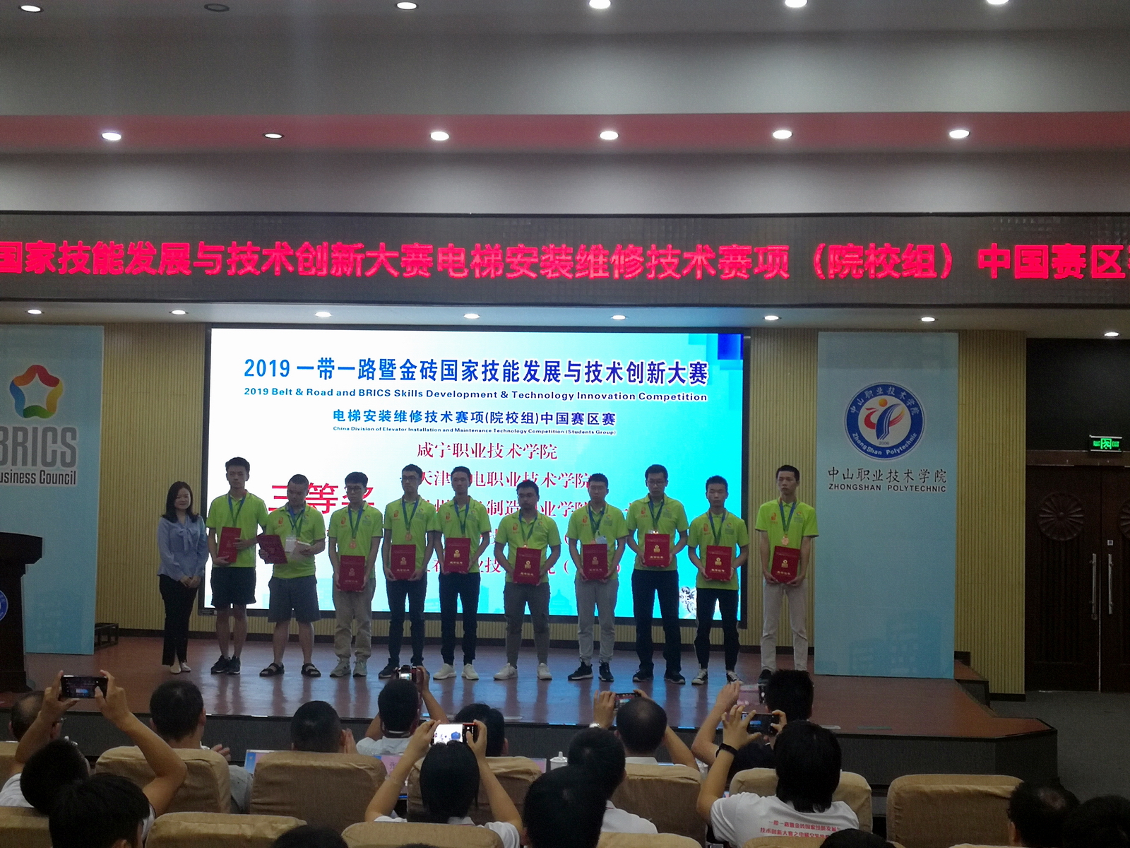 9月22日至9月27日2019一带一路暨金砖国家技能发展与技术创新大赛----电梯安装维修技术赛项在广东中山职业技术公司举行。此次活动有来自韩国、老挝及全国各地共49支代表队的98名选手参加了比赛,公司太阳成集团tyc122cc员工代表队荣获“电梯安装维修技术”赛项三等奖。