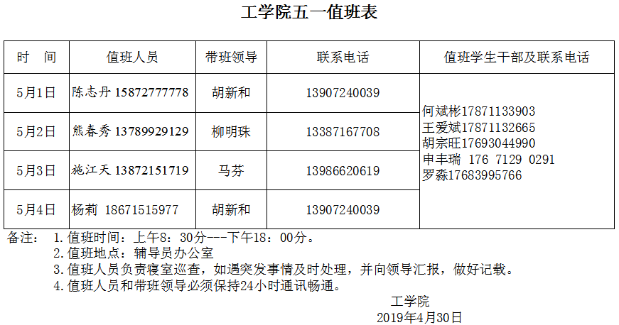 2019年五一假期值班安排表